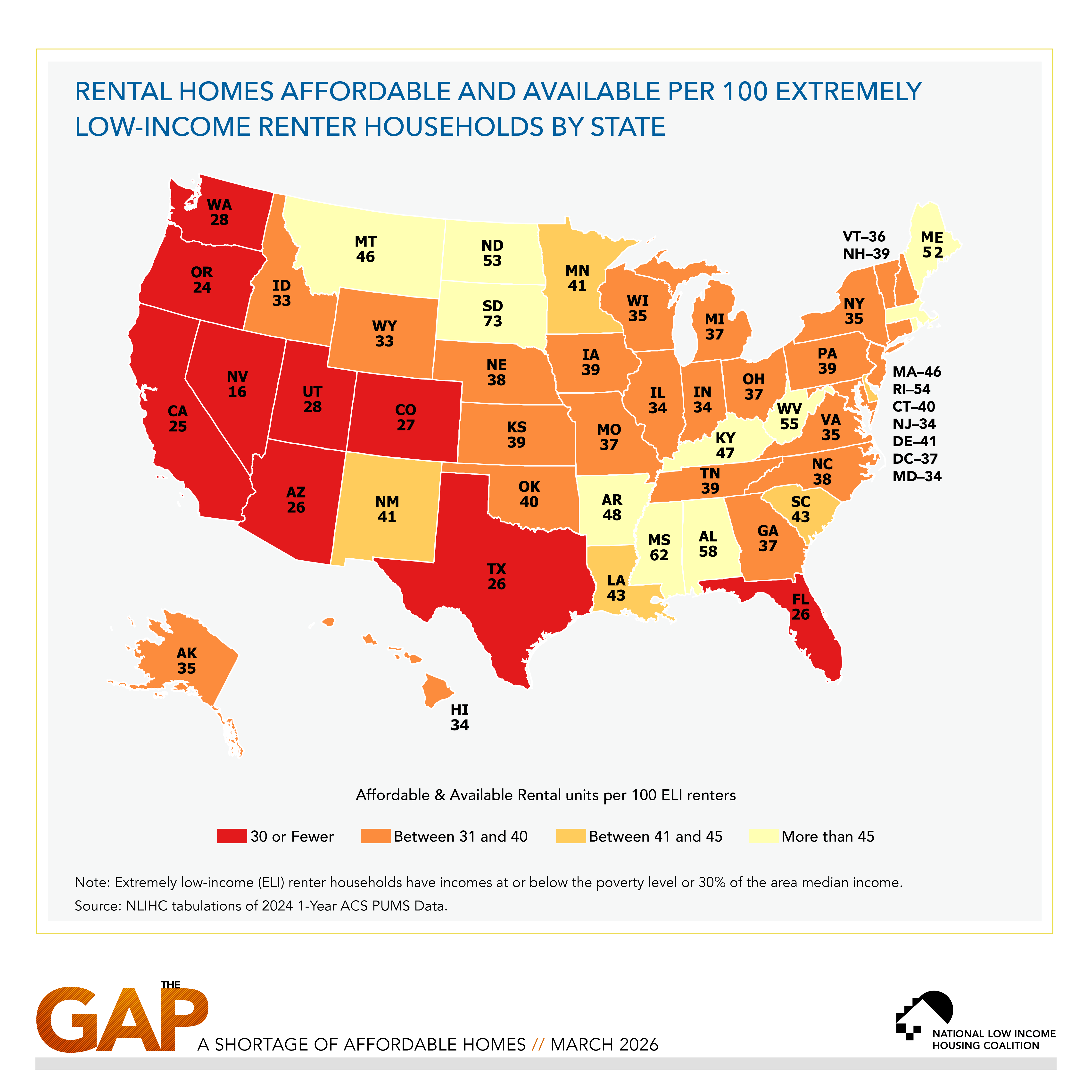 The Gap Report finds that there is no state or major metropolitan area in the United States that has a sufficient supply of affordable and available homes for ELI renter households.